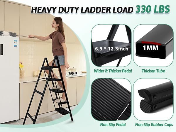 Escalera plegable de 5 peldaños de carga de 350 libras para el hogar/interior, escalera alta de cocina/clóset para adultos, escalera ligera compacta con pedal ancho antideslizante, color