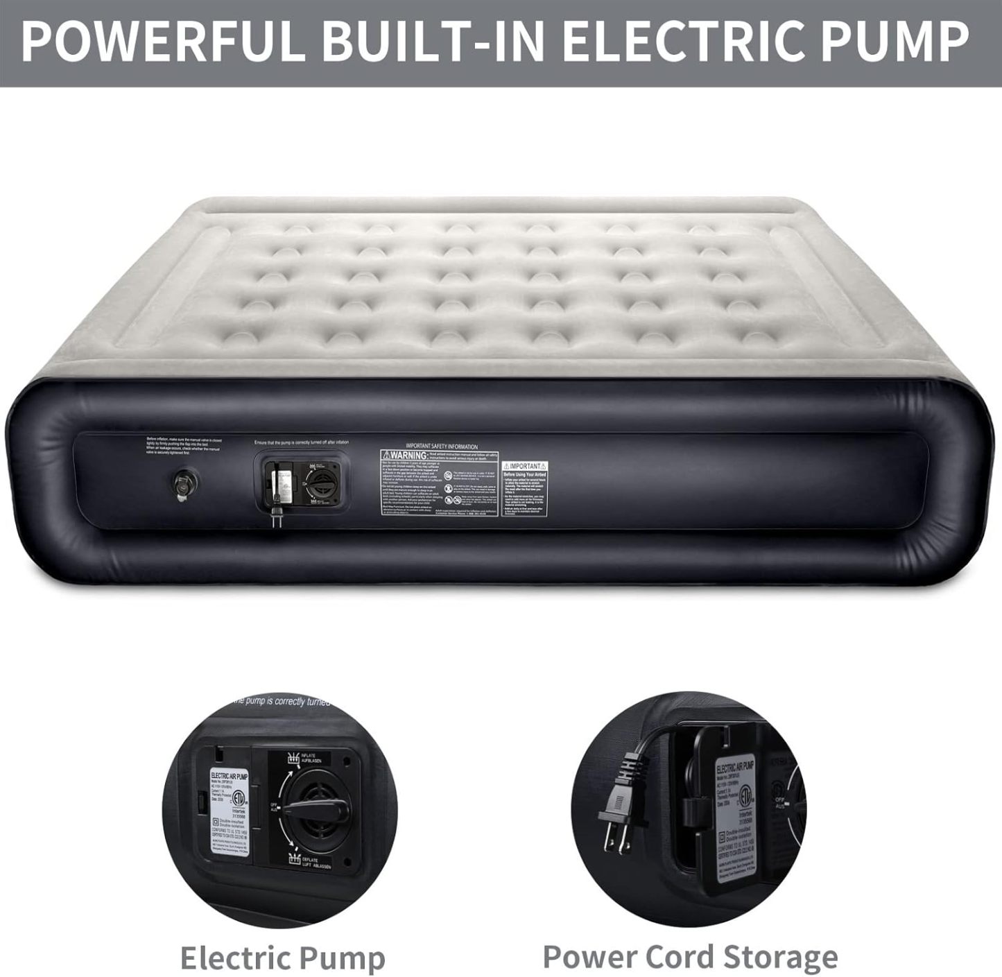 Potente bomba integrada de 120 voltios y válvula adicional 2 en 1 te permiten utilizar el colchón de aire fácilmente sin importar si estás en casa o al aire libre.