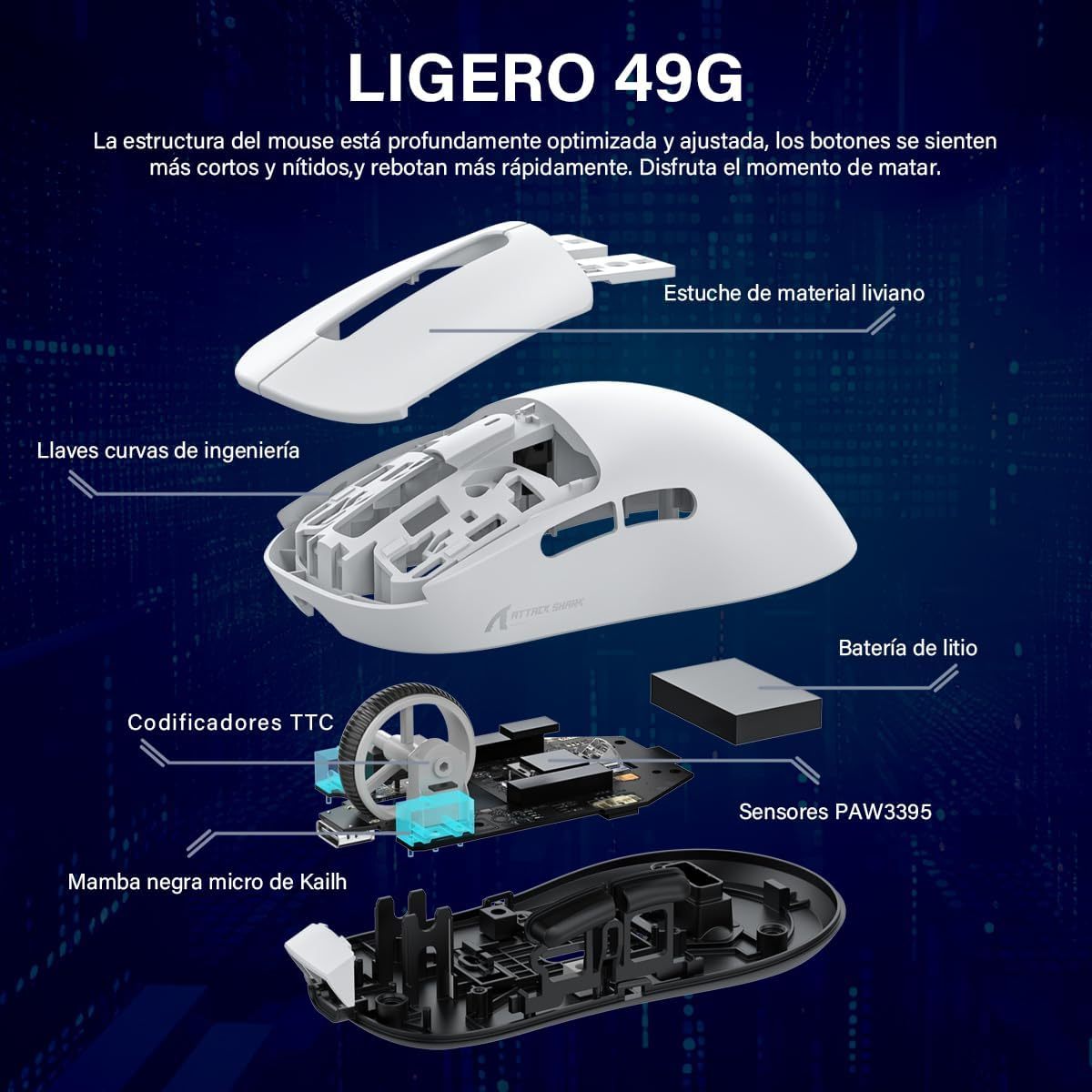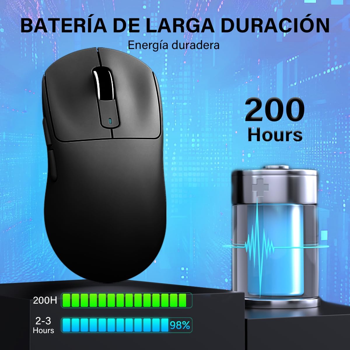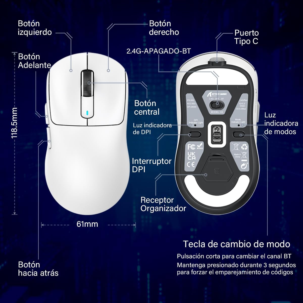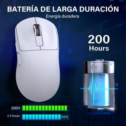 • MOUSE GAMER INALÁMBRICO 3 MODES ULTRALIGERO:Attack Shark X3 mouse inalámbrico recargable cuenta con una carcasa de material ligero avanzado y pesa sólo 49 gramos, lo que lo convierte casi en el ratón más ligero del mercado. Admite tres modos de conexión (2,4 GHz/BT5,2/USB-C), lo que permite conectar varios dispositivos al mismo tiempo para satisfacer diversos escenarios de uso. La duración máxima de la batería es de hasta 200 horas, lo que permite disfrutar de semanas de juego ininterrumpido.