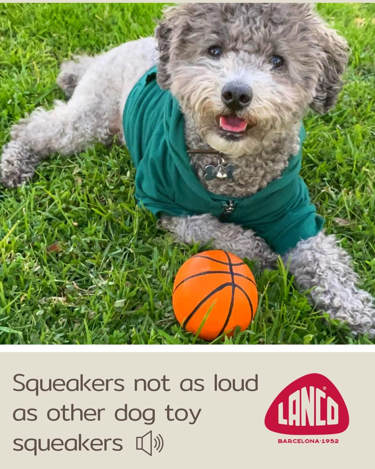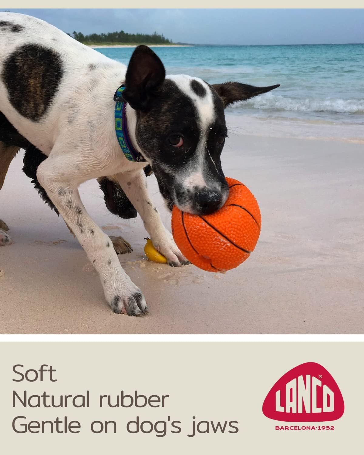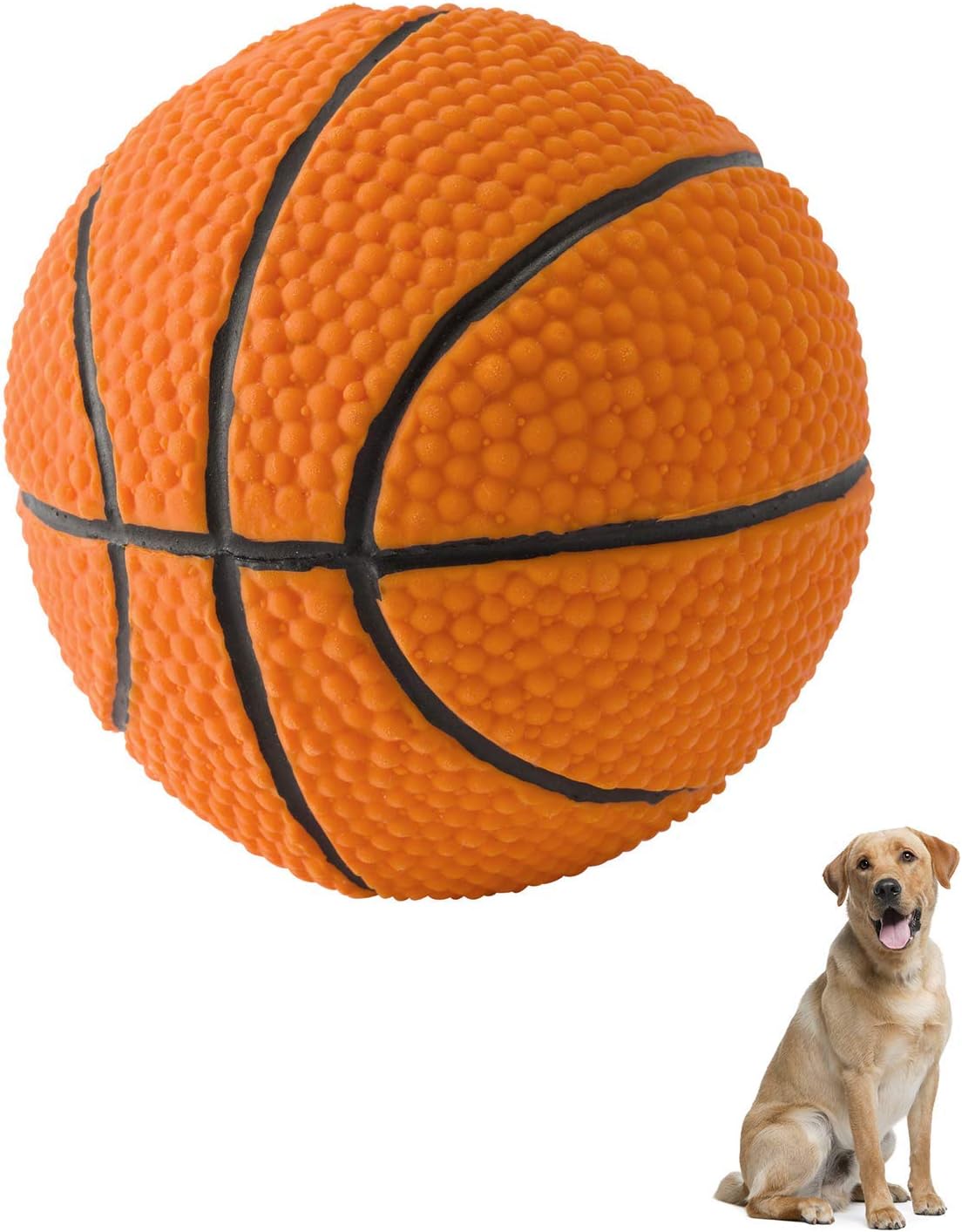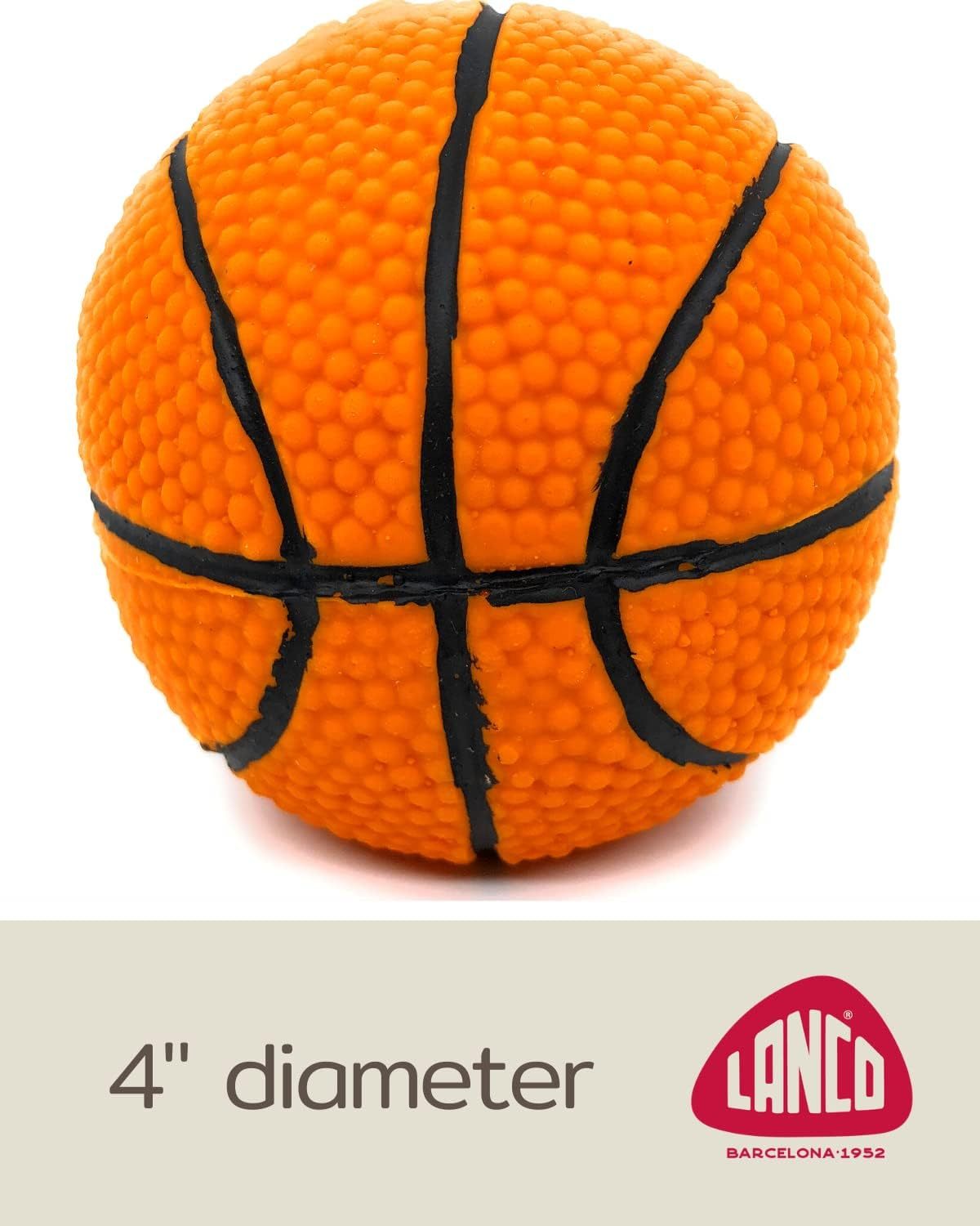 Basketball. 100% Natural Rubber (Latex). 3.93 Inches. Lead-Free & Chemical-Free. Complies to Same Safety Standards as Children's Toys. Soft & Squeaky. Best Dog Toy for Medium-to-Large Dogs.