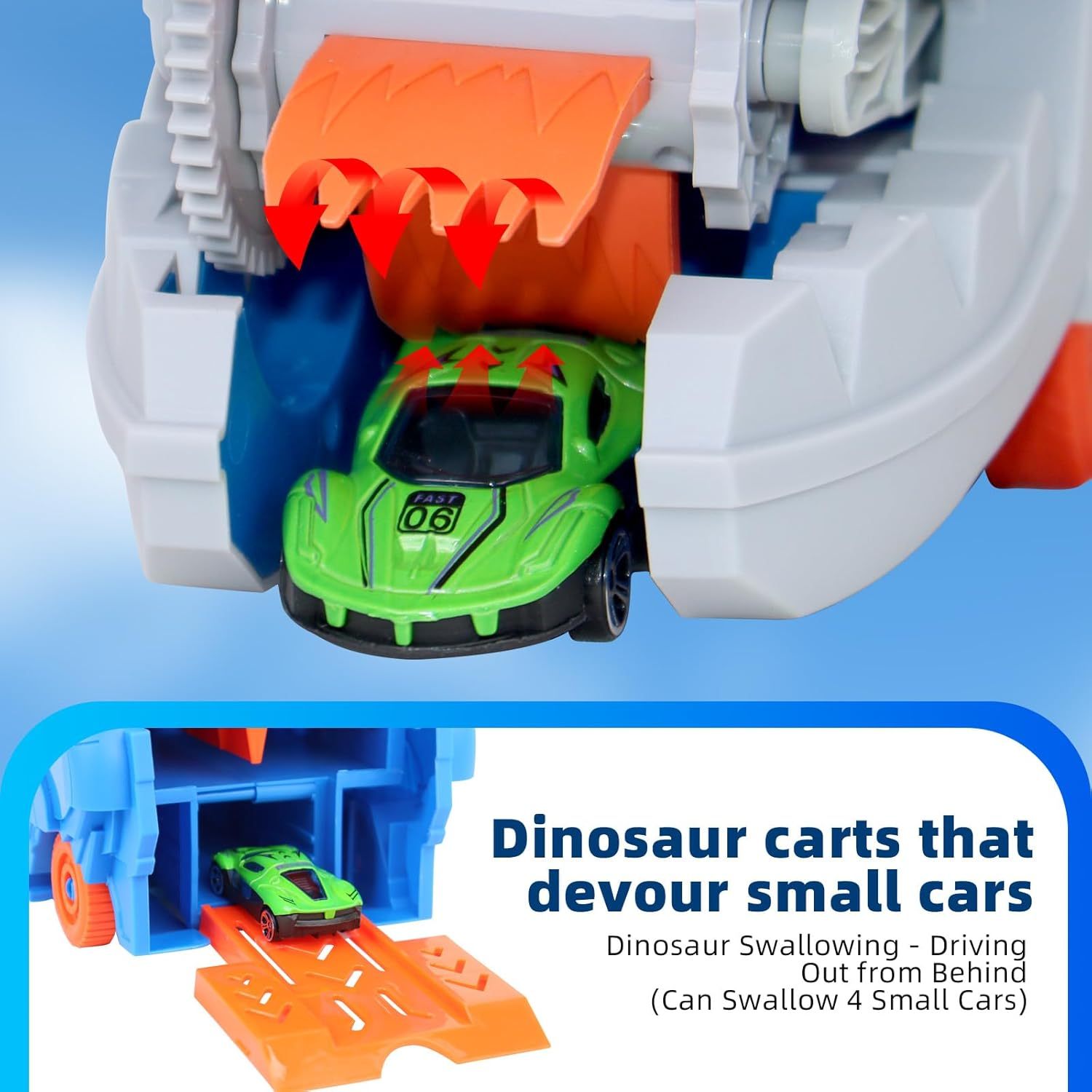 Emocionante experiencia de juego: ve a los niños empujar el coche de dinosaurio y ve cómo este “devora” los coches moldeados, lo que añade un toque emocionante al juego y crea una sensación de diversión. Su innovador diseño aporta novedad y emoción, mejorando la experiencia de juego de los jóvenes aventureros.