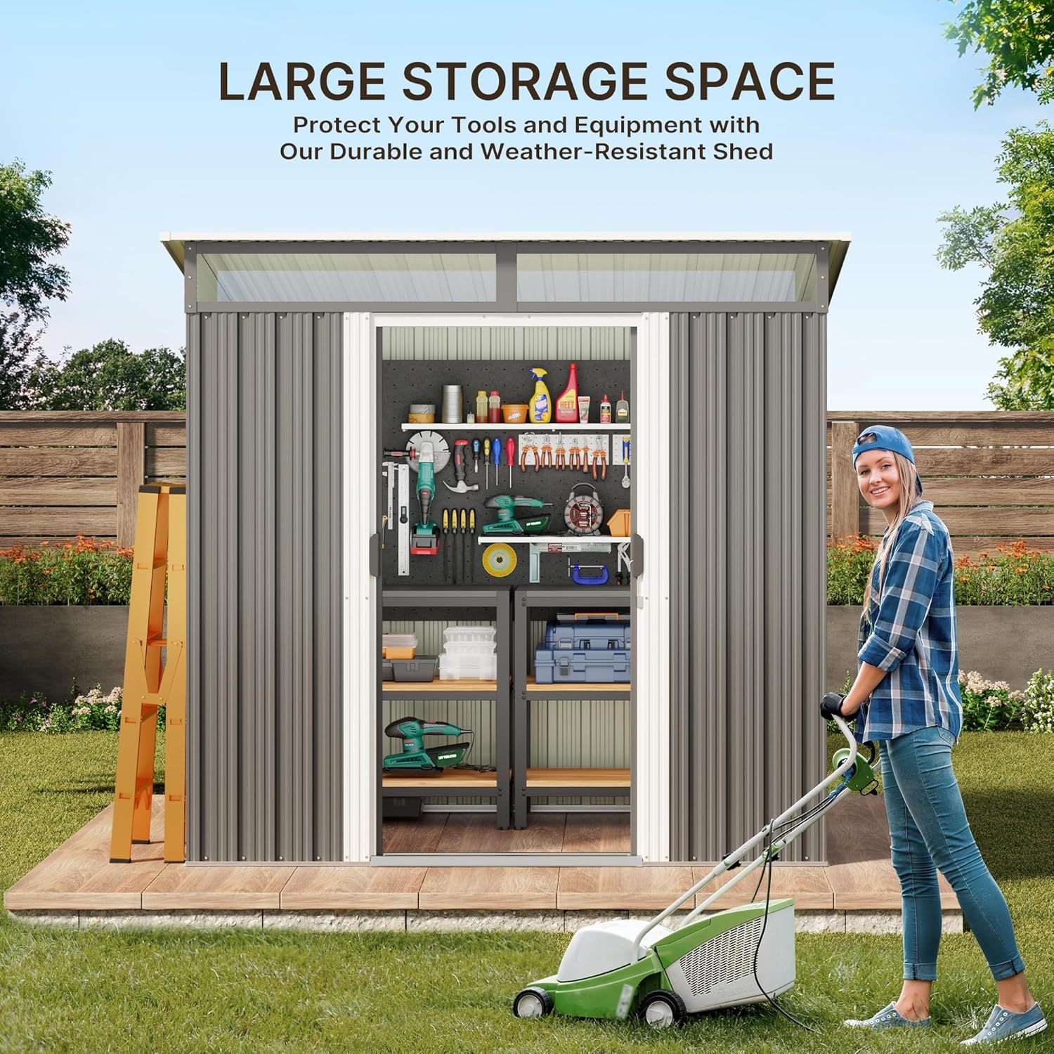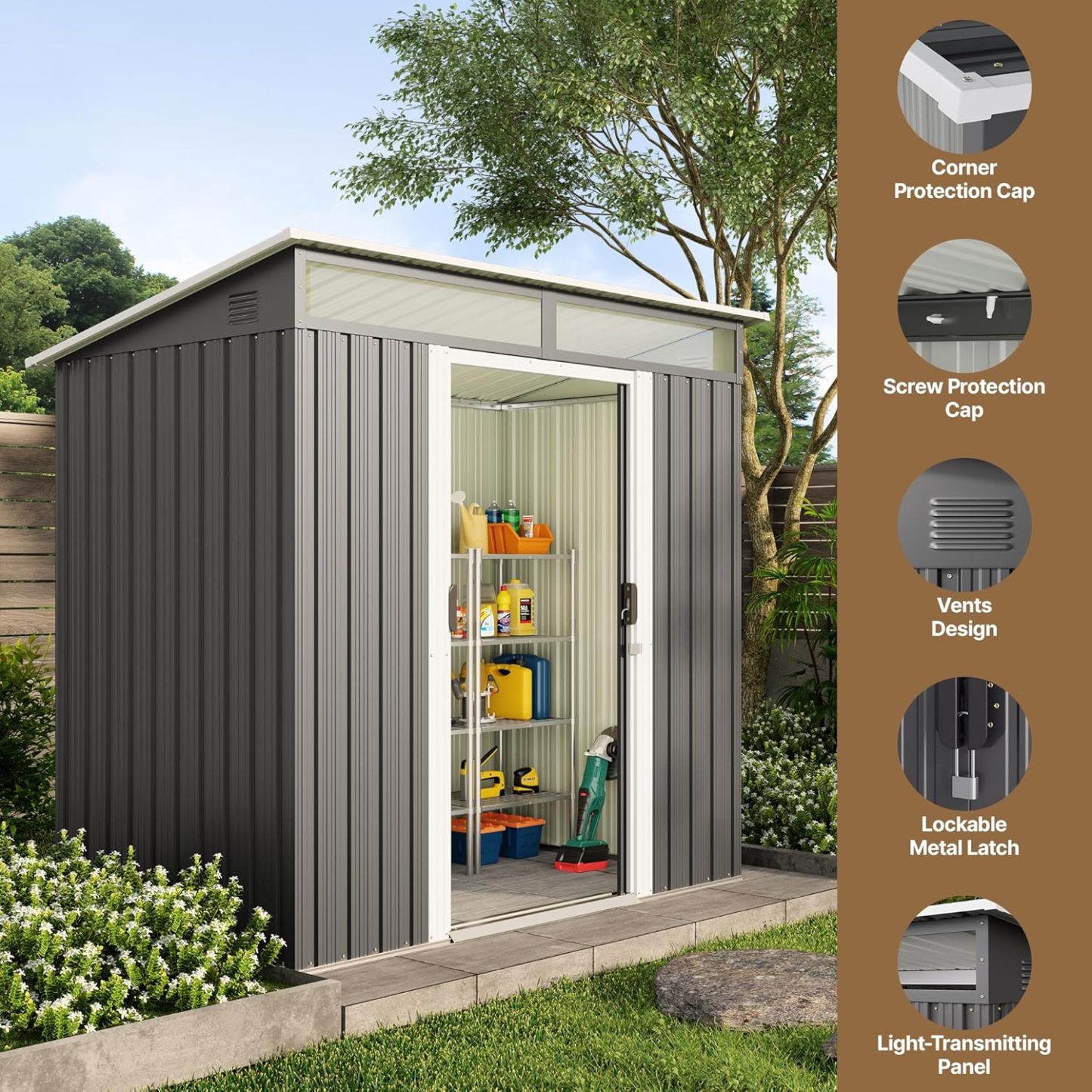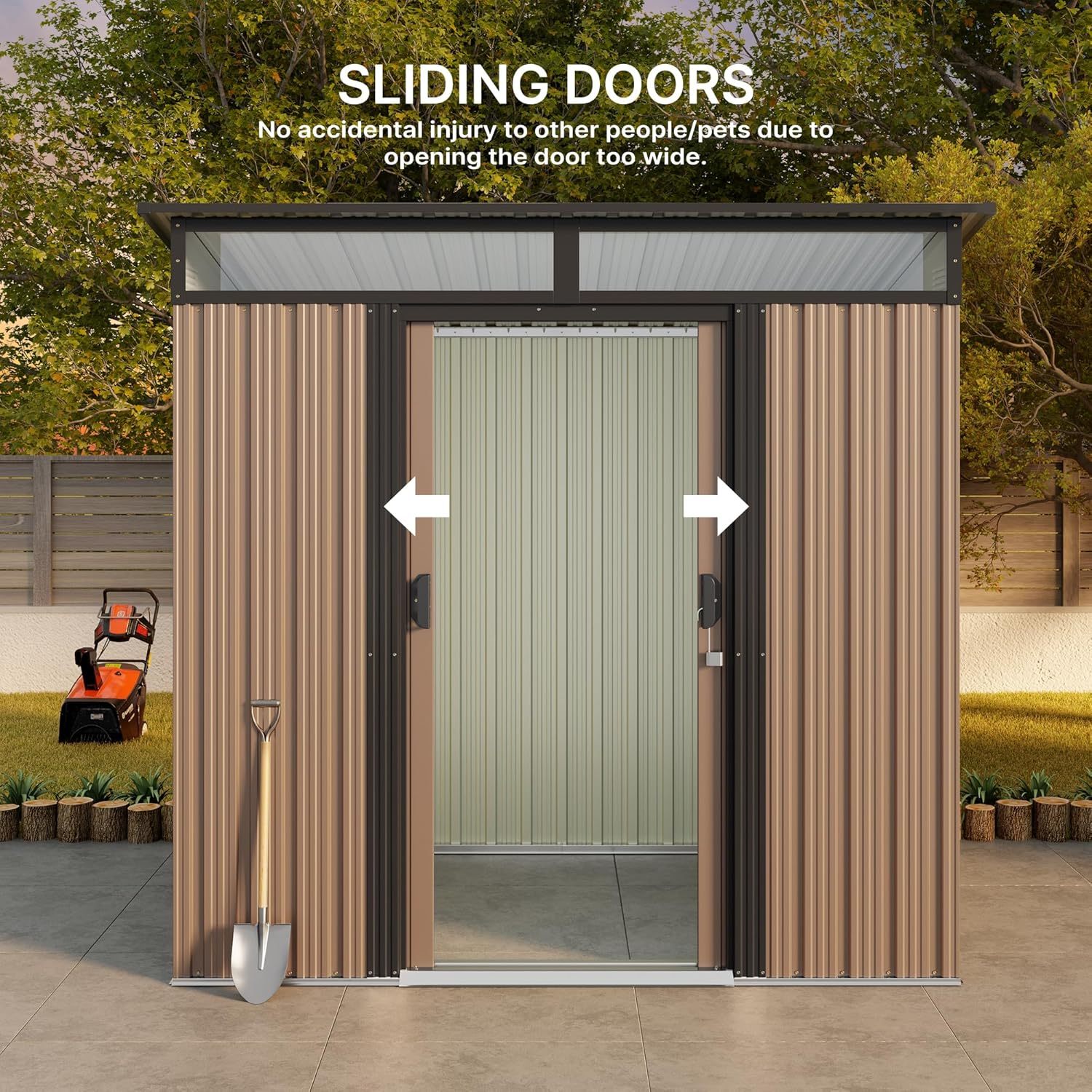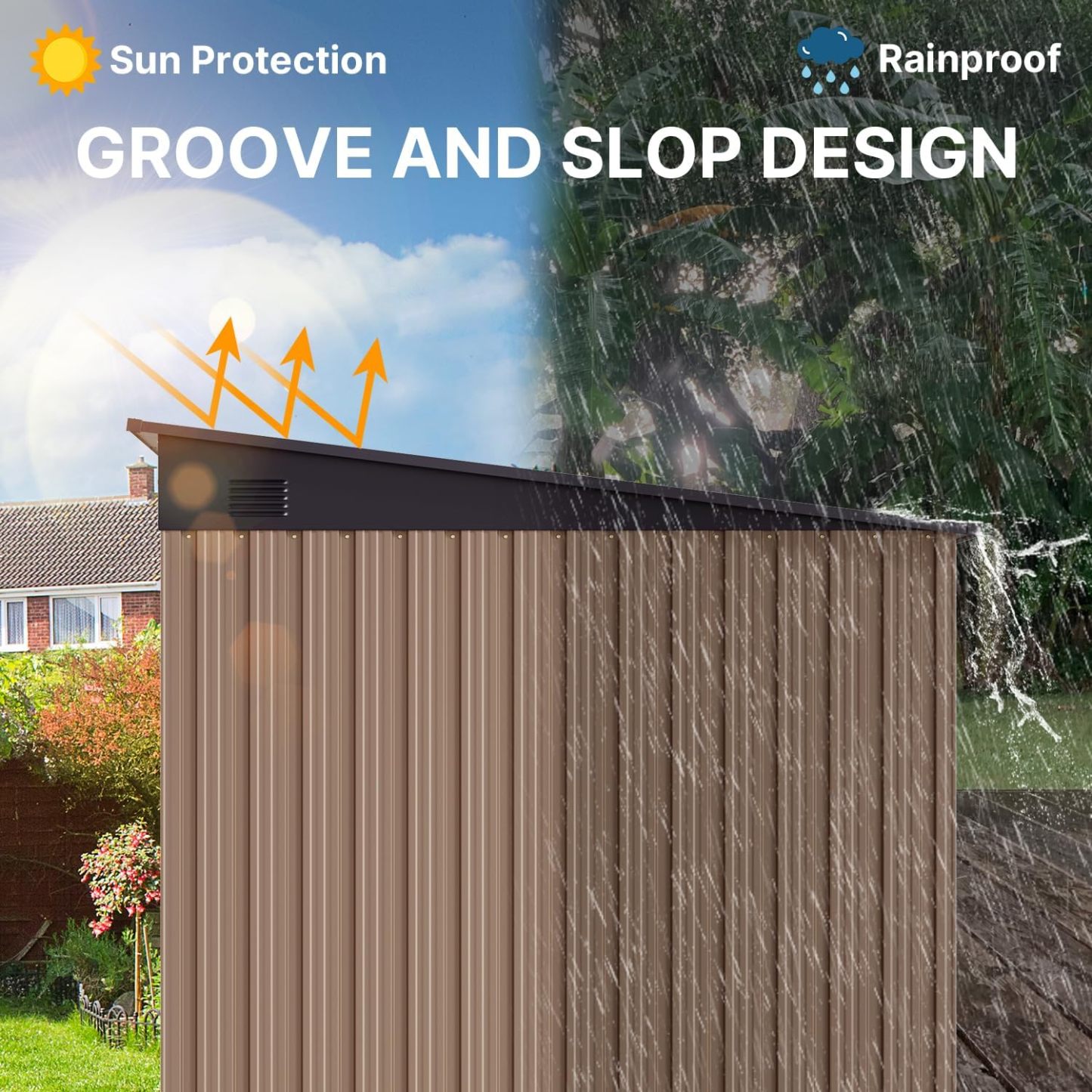 - Diseño ventilado resistente a la lluvia: el techo inclinado evita eficazmente la acumulación de agua, mientras que las aberturas de ventilación laterales promueven el flujo de aire para mantener tus artículos secos. Las clásicas puertas correderas proporcionan un fácil acceso a tus artículos almacenados, por lo que es una opción ideal para almacenar de forma segura herramientas y equipos valiosos