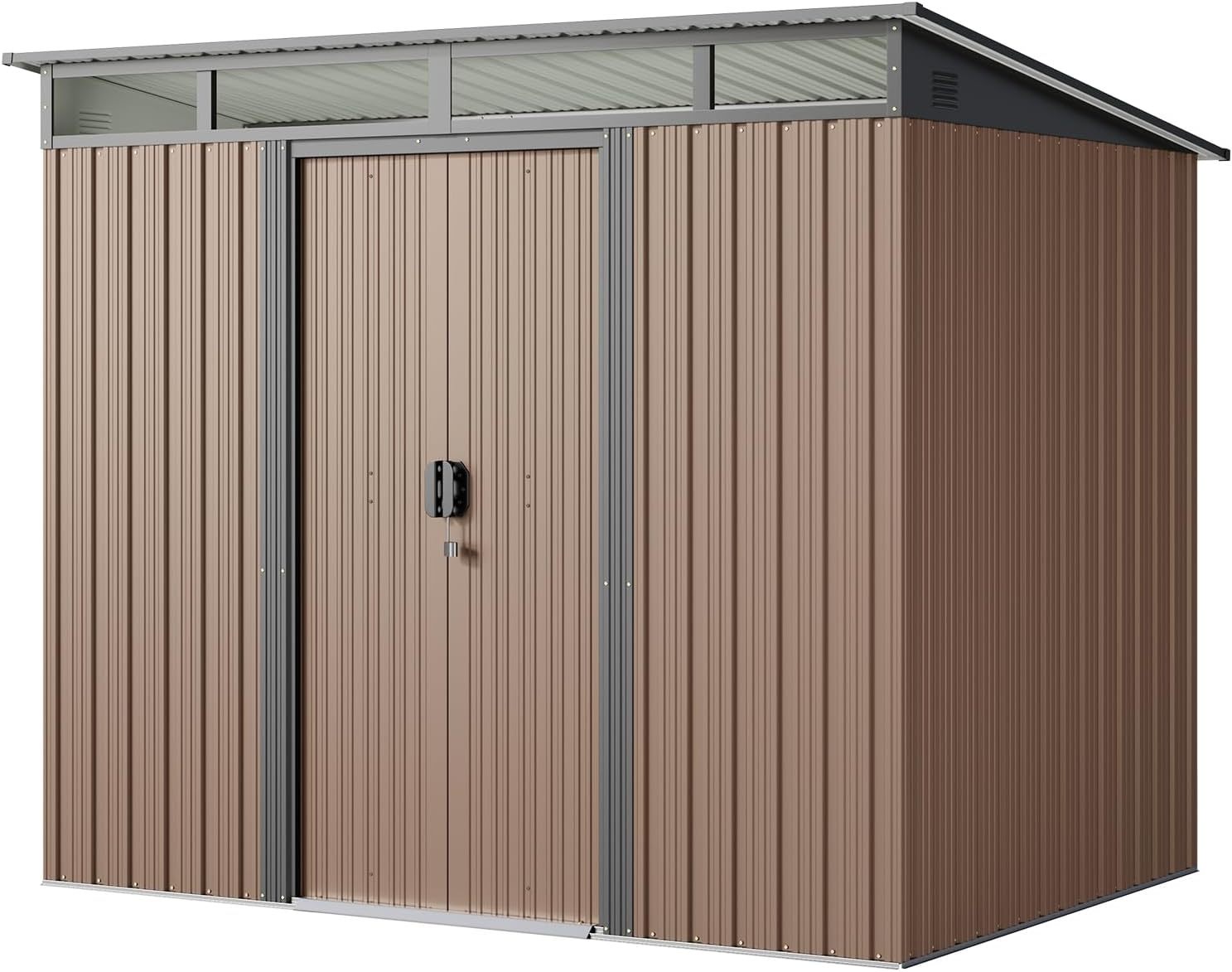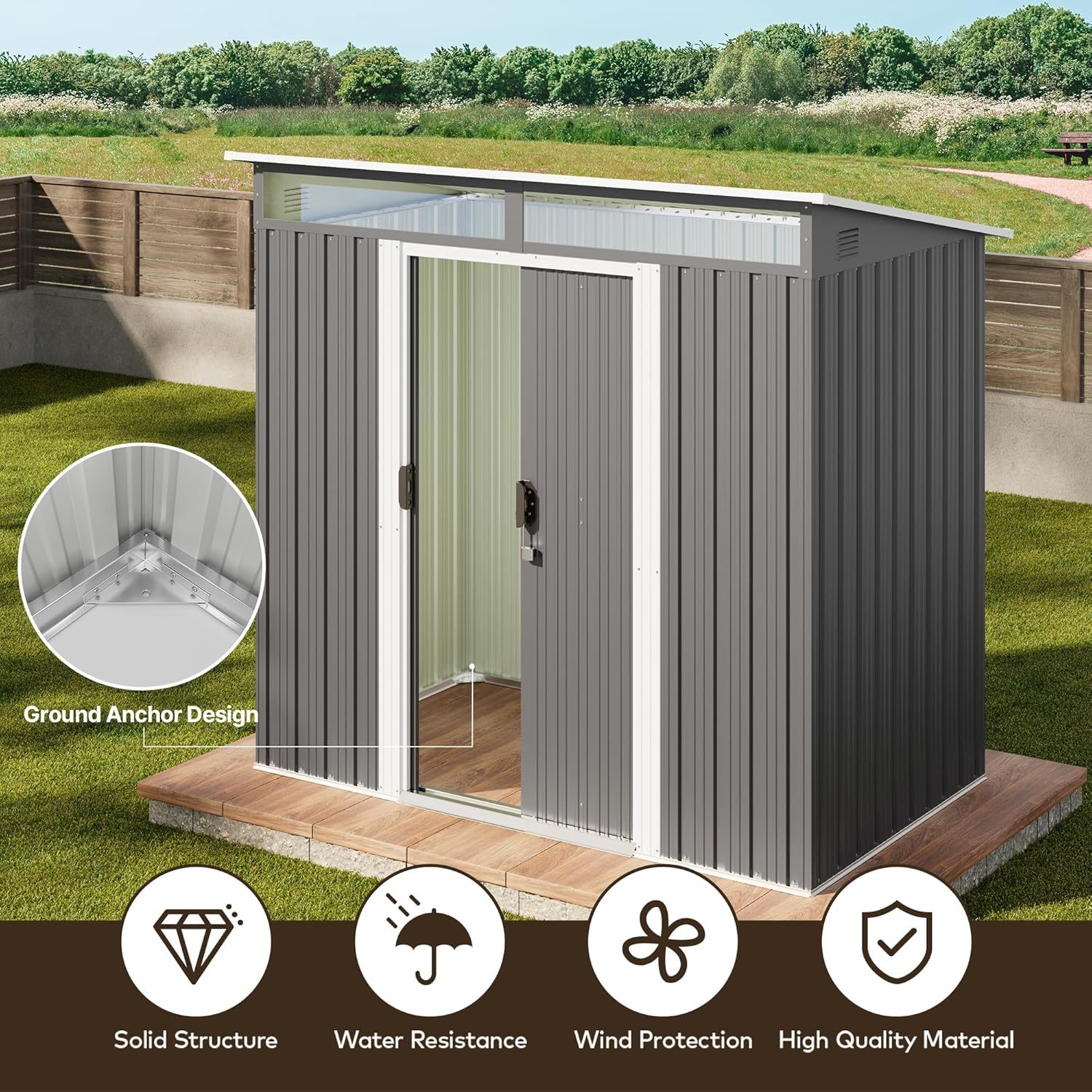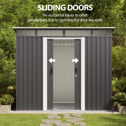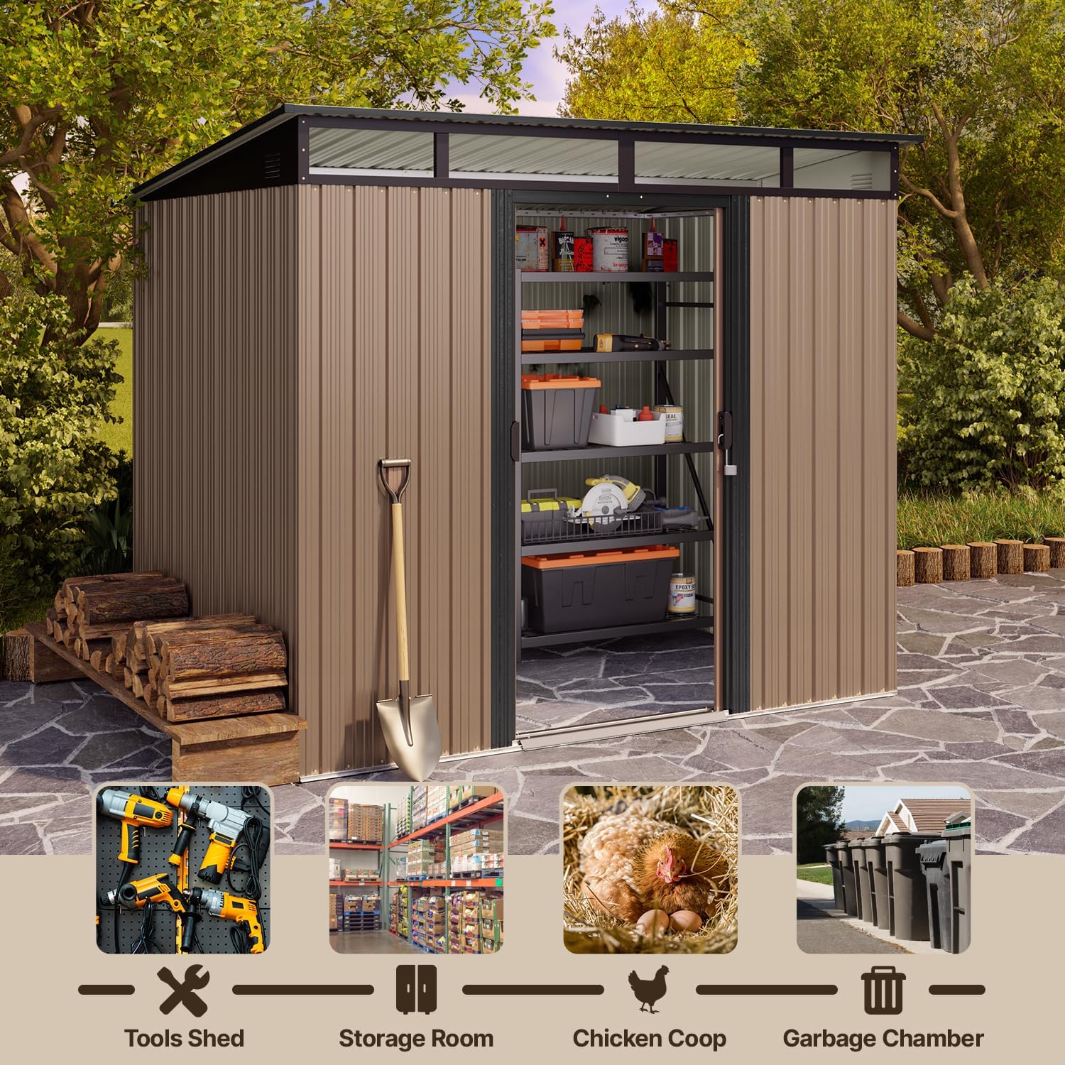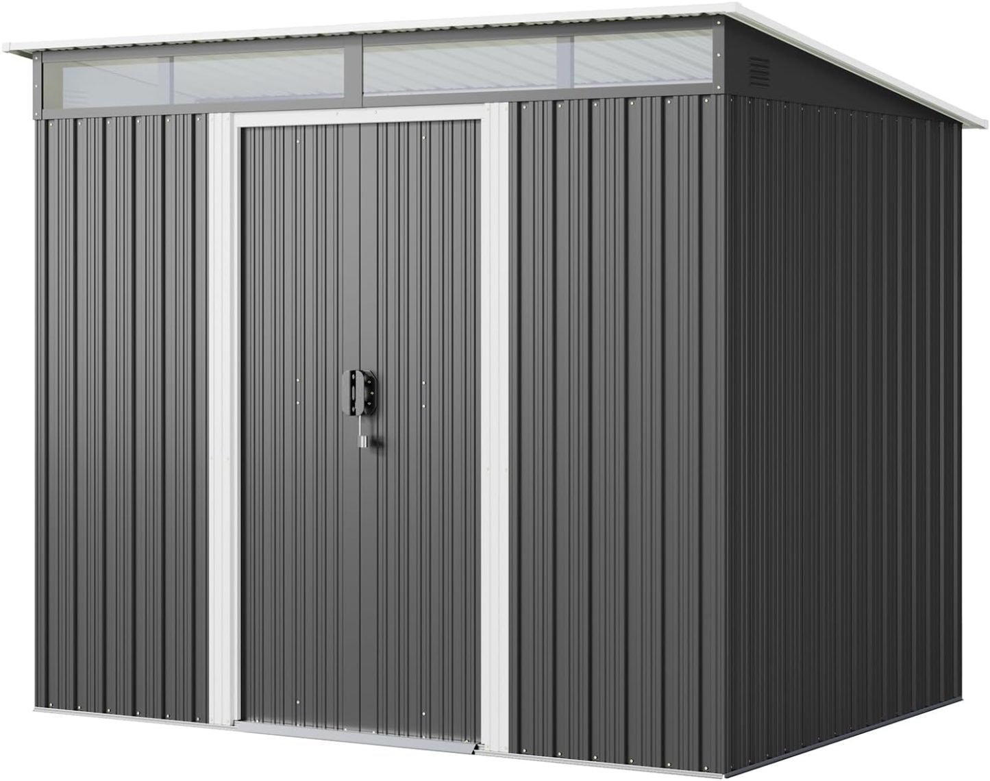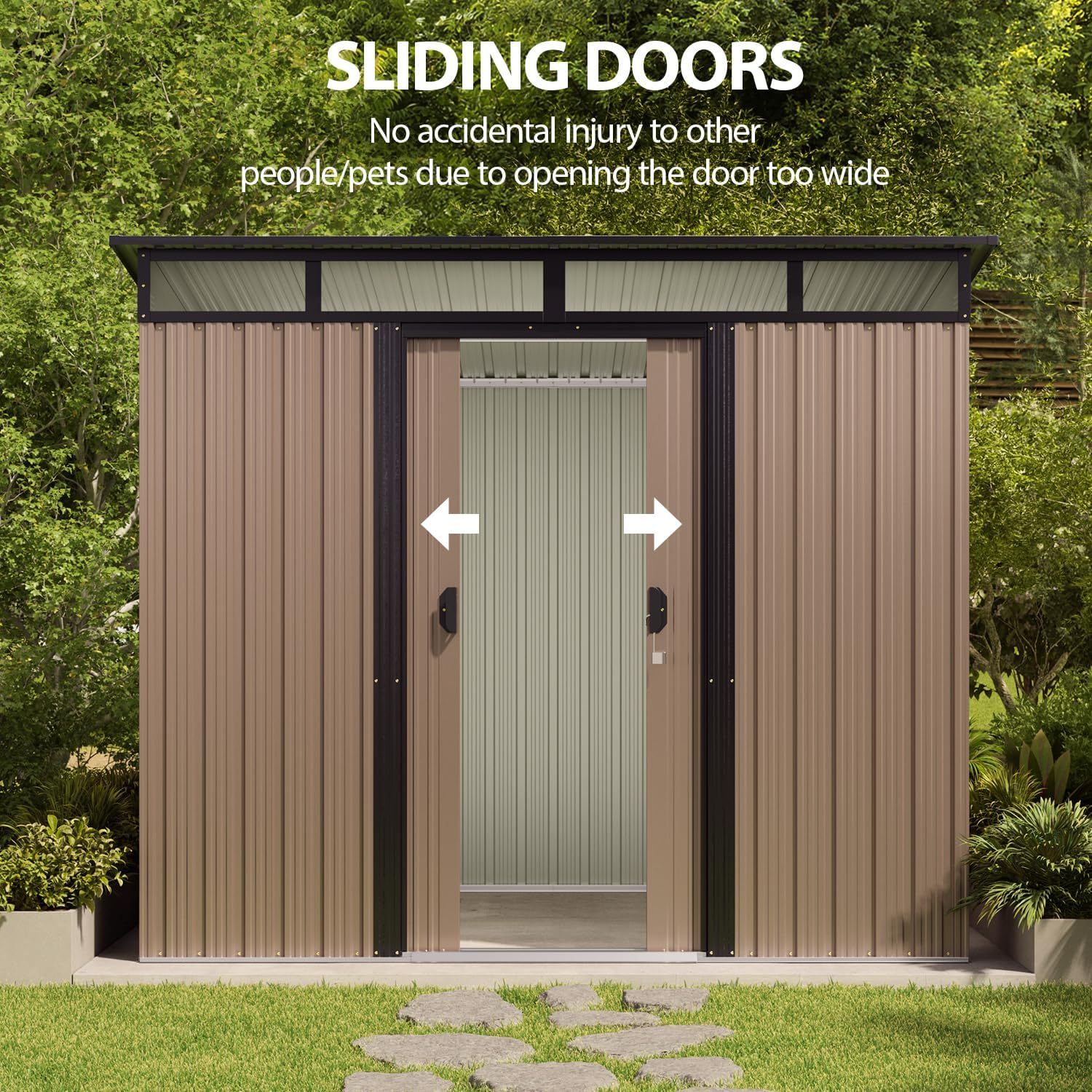 - Diseño ventilado resistente a la lluvia: el techo inclinado evita eficazmente la acumulación de agua, mientras que las aberturas de ventilación laterales promueven el flujo de aire para mantener tus artículos secos. Las clásicas puertas correderas proporcionan un fácil acceso a tus artículos almacenados, por lo que es una opción ideal para almacenar de forma segura herramientas y equipos valiosos