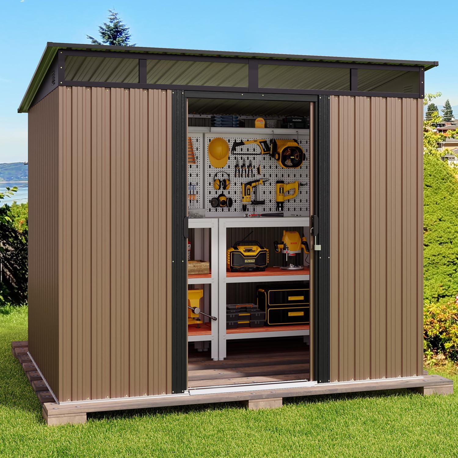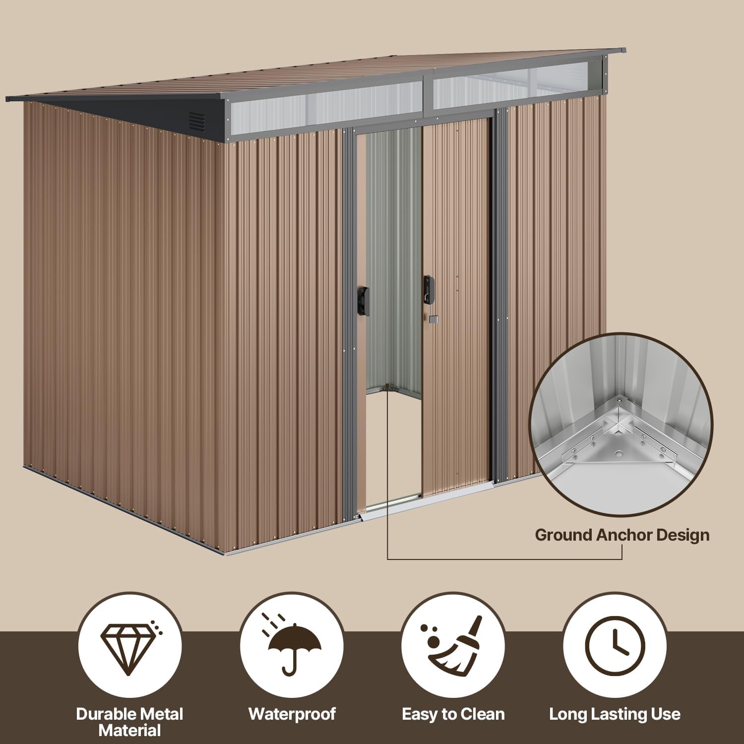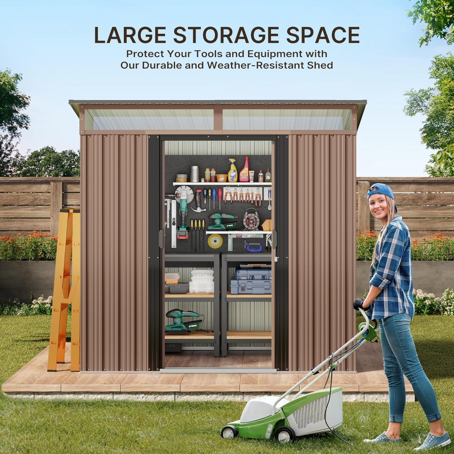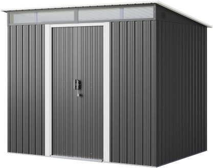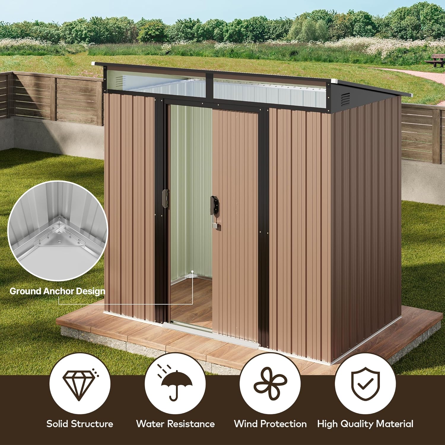 - Diseño ventilado resistente a la lluvia: el techo inclinado evita eficazmente la acumulación de agua, mientras que las aberturas de ventilación laterales promueven el flujo de aire para mantener tus artículos secos. Las clásicas puertas correderas proporcionan un fácil acceso a tus artículos almacenados, por lo que es una opción ideal para almacenar de forma segura herramientas y equipos valiosos