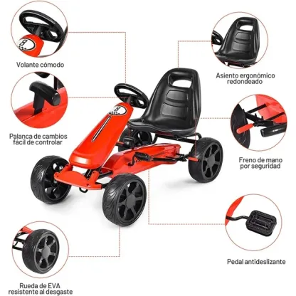 Feature Asiento regulable que se adapta a la atura de los niños para que jueguen mejor|| Volante ergonómico fácil y cómodo de controlar para cambiar de dirección|| Con ruedas en EVA antideslizantes amortiguadores y resistentes al desgaste|| Embrague para ir adelante y atrás libremente|| Freno de mano para parar el coche si necesario|| Diseño de pedales fácil para acelerar y decelerar|| Hecho con un material de alta calidad muy resistente y duradero|| Mejora la coordinación mano-ojo de los niños y los hace sentir felices