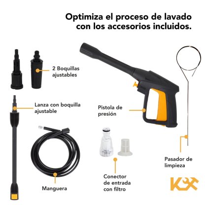 • Incluye: 1 Hidrolavadora, 1 pistola de presión, 1 lanza con boquilla ajustable, 1 manguera, 1 cepillo con conector, 1 conector de entrada con filtro, 1 pasador de limpieza, 1 aplicador de jabón, 1 instructivo.