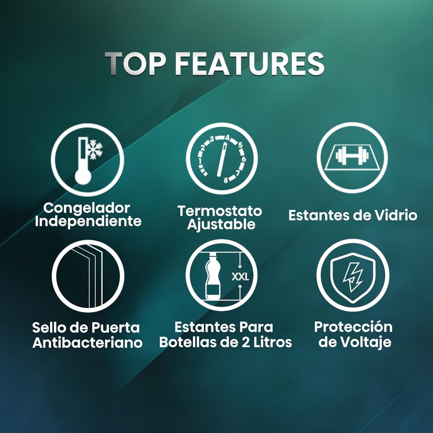 Congelador independiente, Termostato ajustable, Sello de Puerta Antibacteriano, Estantes de Vidrio, Estantes para botellas de 2 litros