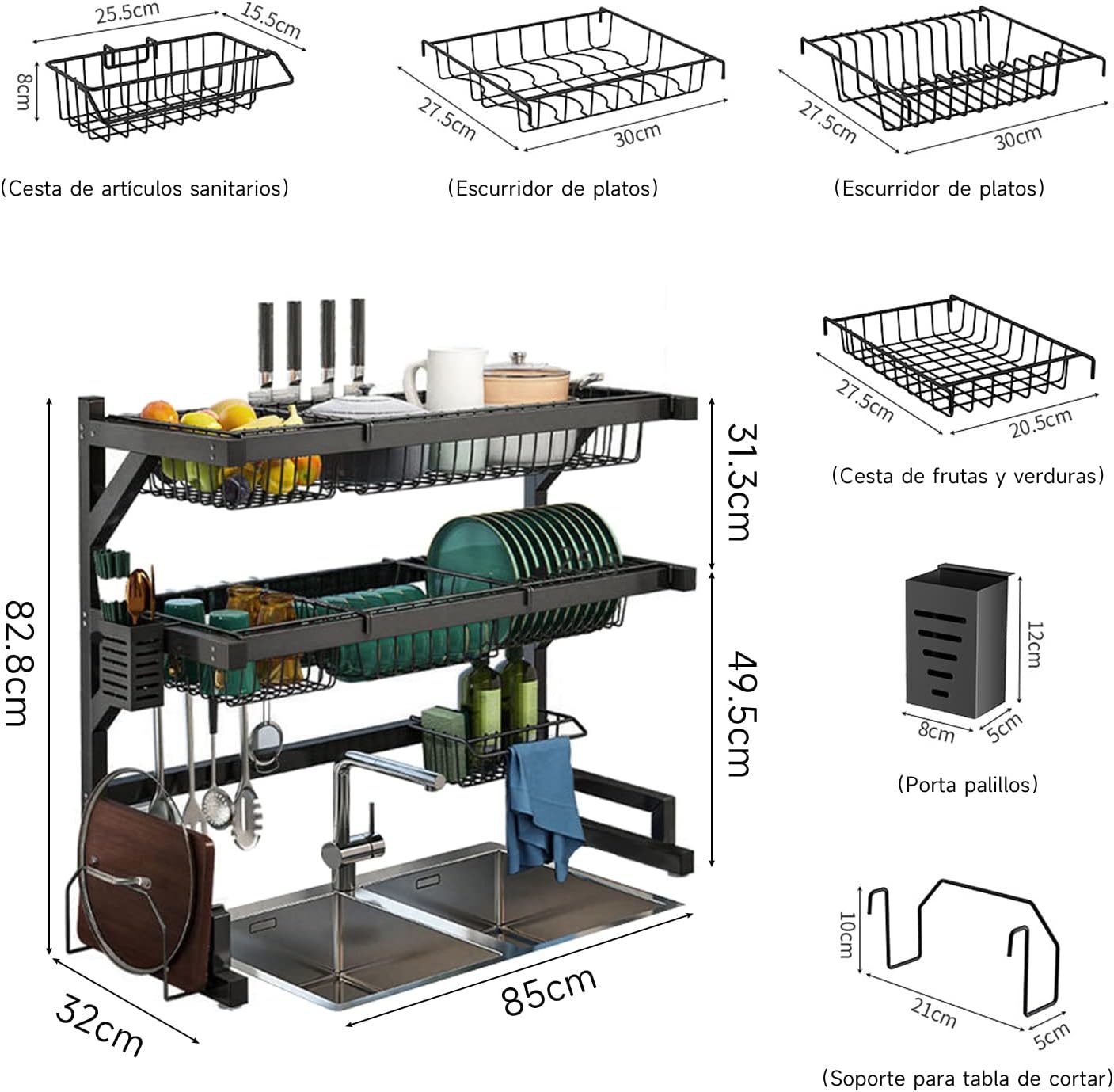 JEMUON Escurridor de Trastes, Escurridor de Trastes sobre Fregadero, Escurridor de Trastes Acero Inoxidable de 2 Niveles, 11 en 1 Escurridor de Trastes Grande para Organizador de Cocina