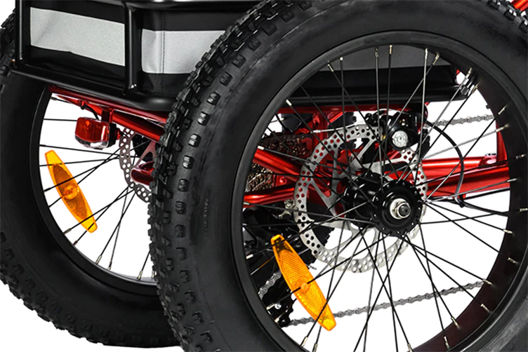 El triciclo eléctrico con llantas gruesas está equipado con frenos de disco dobles de 180 mm en todas las ruedas, lo que evita vuelcos de manera efectiva. Al frenar, el disco de freno se puede sujetar con sensibilidad y firmeza según sus necesidades.