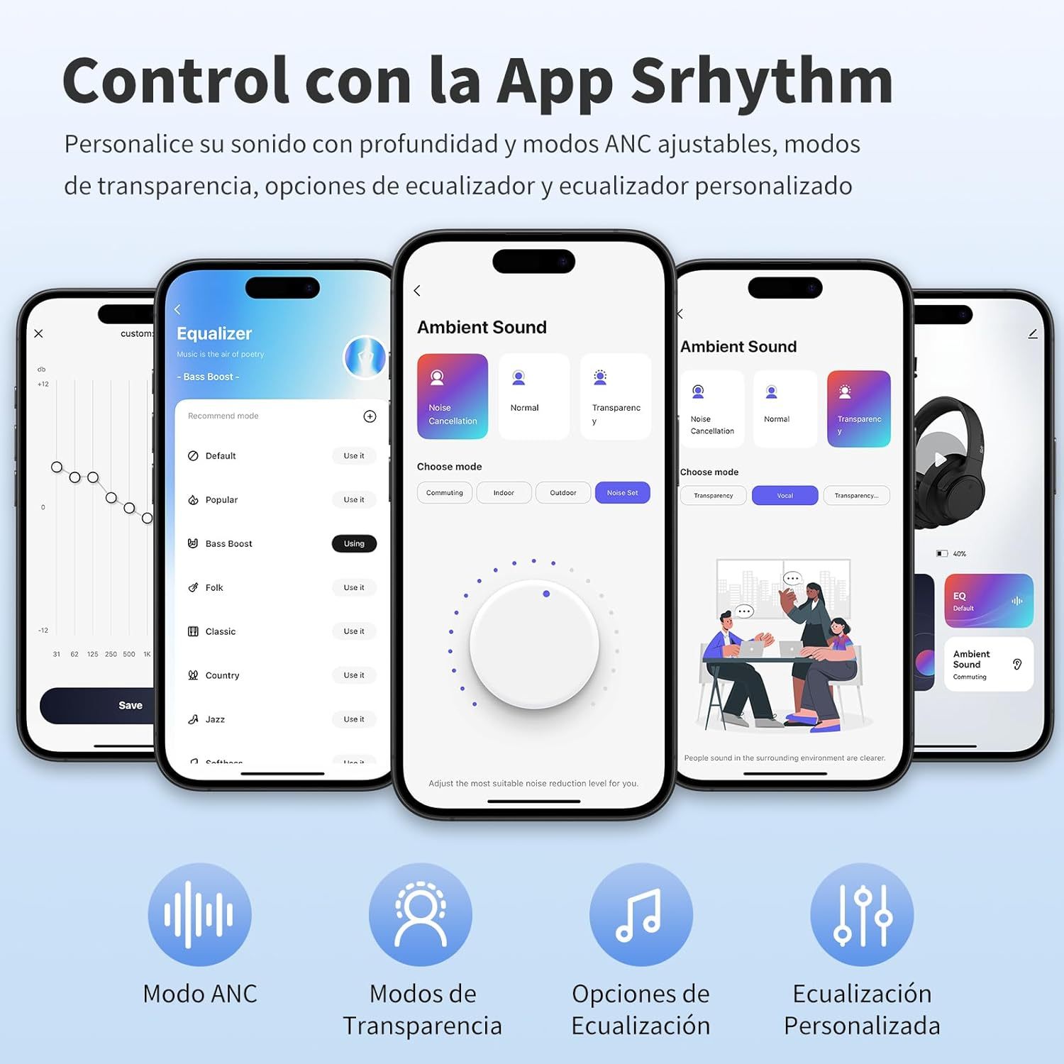 Larga duración de 120 horas de reproducción y baja latencia: con una sola carga de la semana, esto es 5 días completos de música, llamadas y películas sin interrupciones. Disfruta de un sonido sin problemas gracias a Bluetooth 6.0, que se mantiene perfectamente sincronizado con tus vídeos y juegos. La aplicación Srhythm ofrece opciones para modos de ecualización y otras funciones