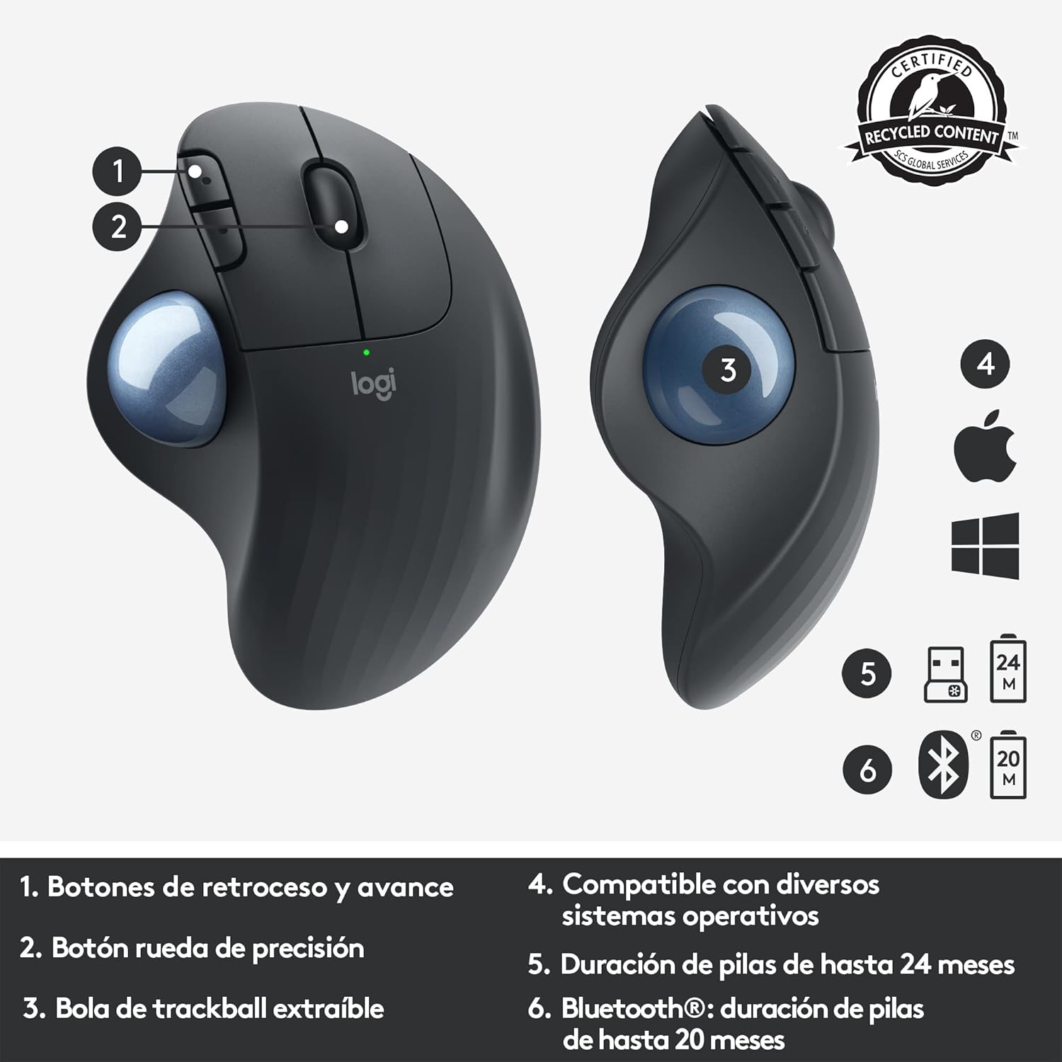 • Suave control del pulgar: rastrea con precisión y control el cursor en cualquier superficie y con un sencillo trackball manejado con el pulgar; ajusta su velocidad con el software logitech options