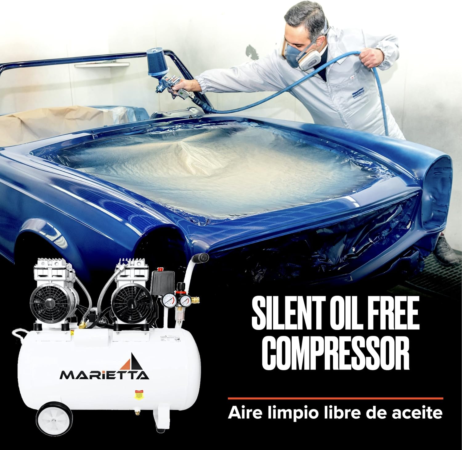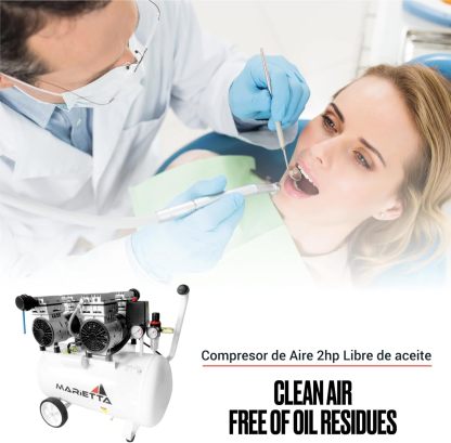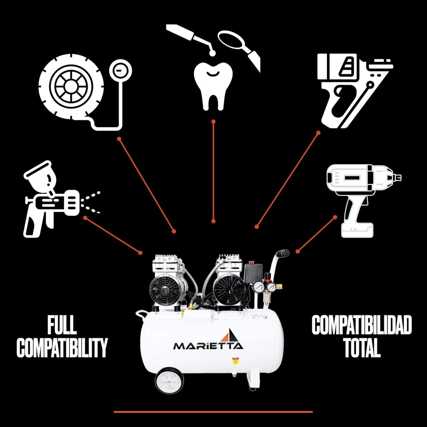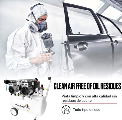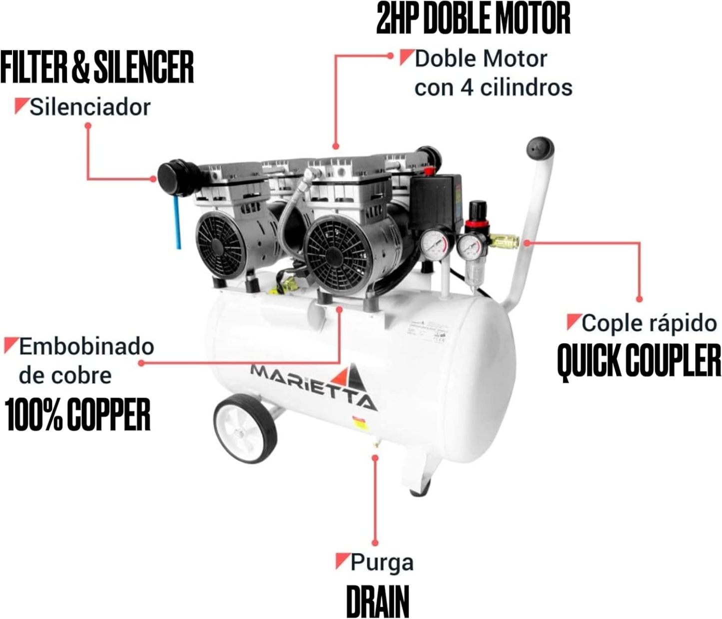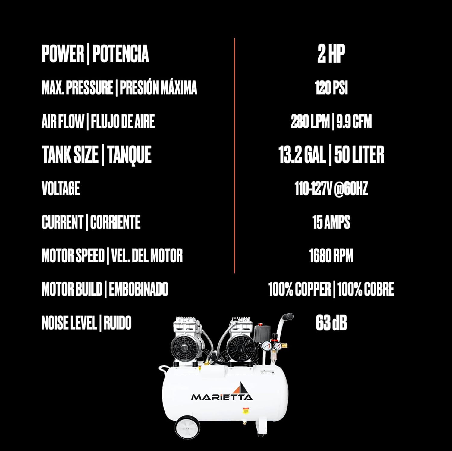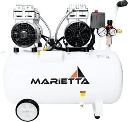 MARIETTA 2HP 50L: Compresor de Aire Silencioso - Compresor robusto de llenado rápido con 2 HP y tanque de 50L. Doble Motor Libre de Aceite.