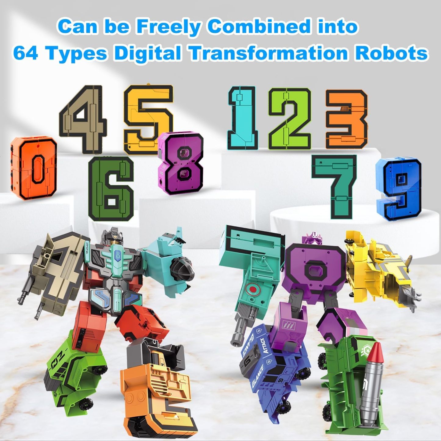 Diversas formas de jugar: el juguete único de bloques de números 5 en 1 de HOPANDOS da a los niños una experiencia de construcción sin precedentes. Contiene 10 bloques de construcción digitales deformables independientemente, que no solo se pueden utilizar como robots solos, sino también combinados en 2 superrobots ampliados. Todo el juego tiene 64 combinaciones diferentes, y cada conjunto puede traer una nueva experiencia, lo que permite a los niños descubrir nueva diversión y desatar creatividad ilimitada constantemente.