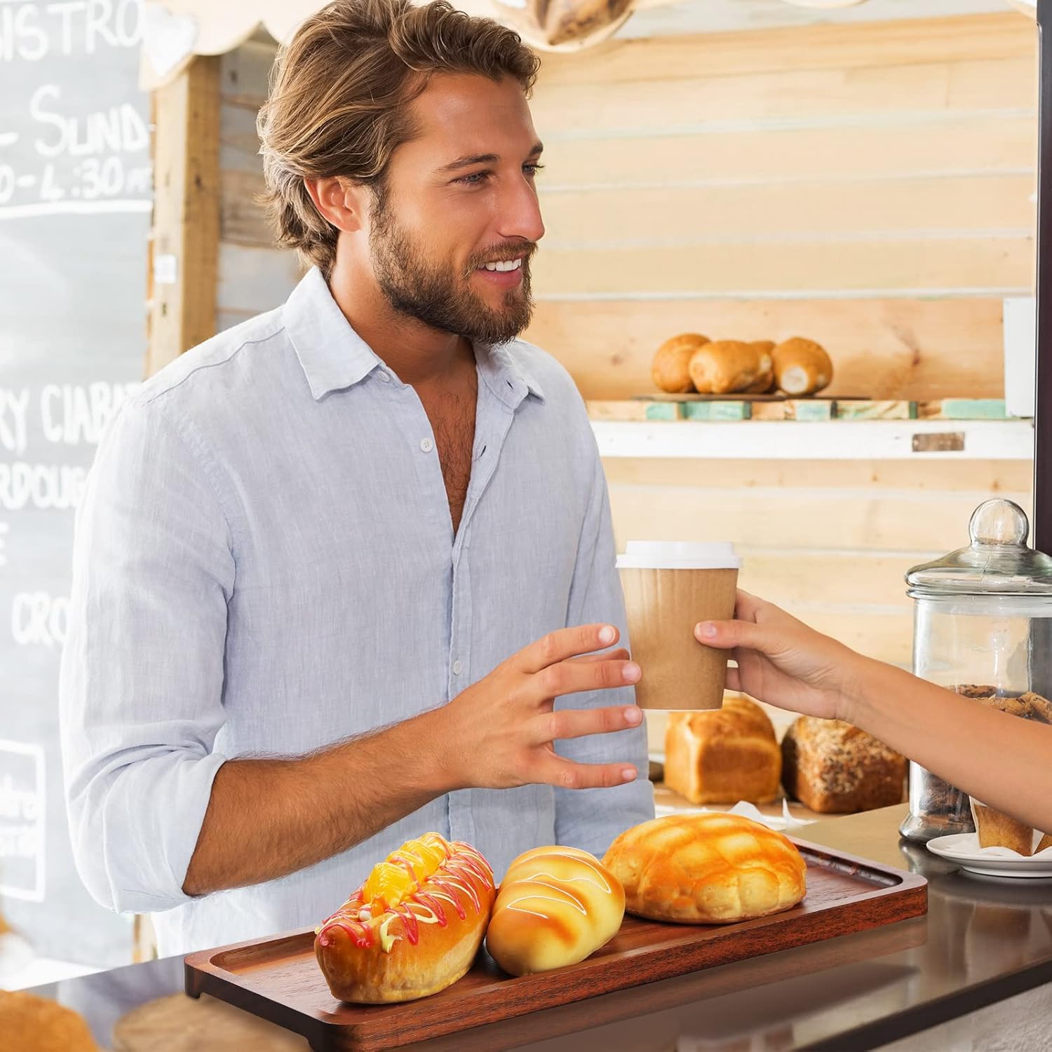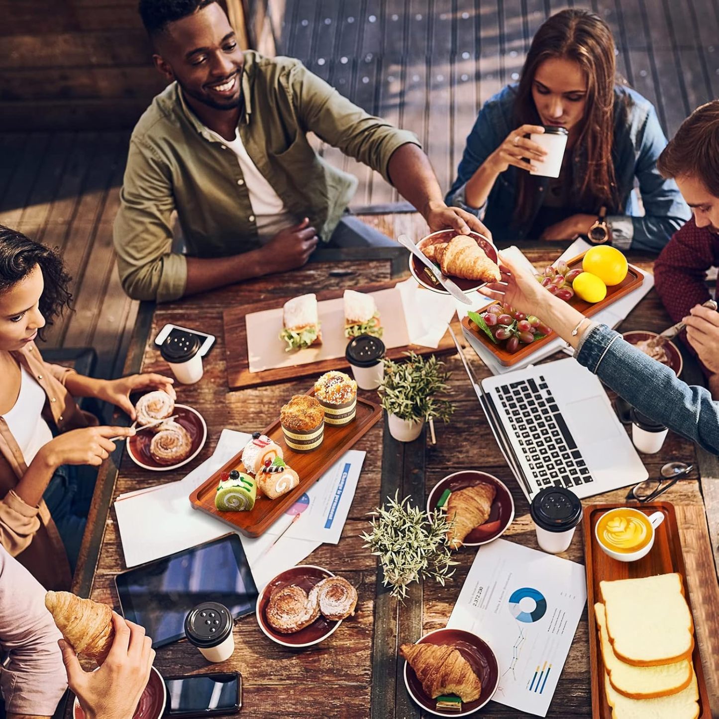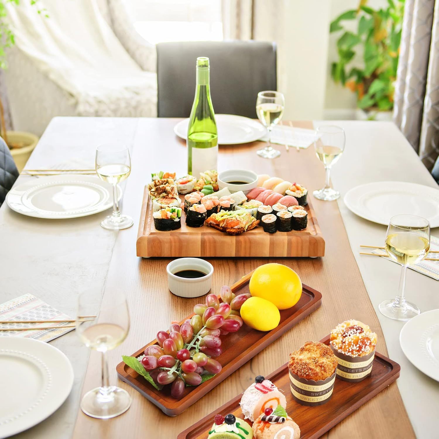 Skylety Paquete de 15 bandejas de servir de madera maciza grande de acacia para fiesta, tablero rectangular de embutidos con mango ranurado para el hogar, cocina, queso, aperitivo, granja, suministros de mesa (13.8 x 5.4 pulgadas)
