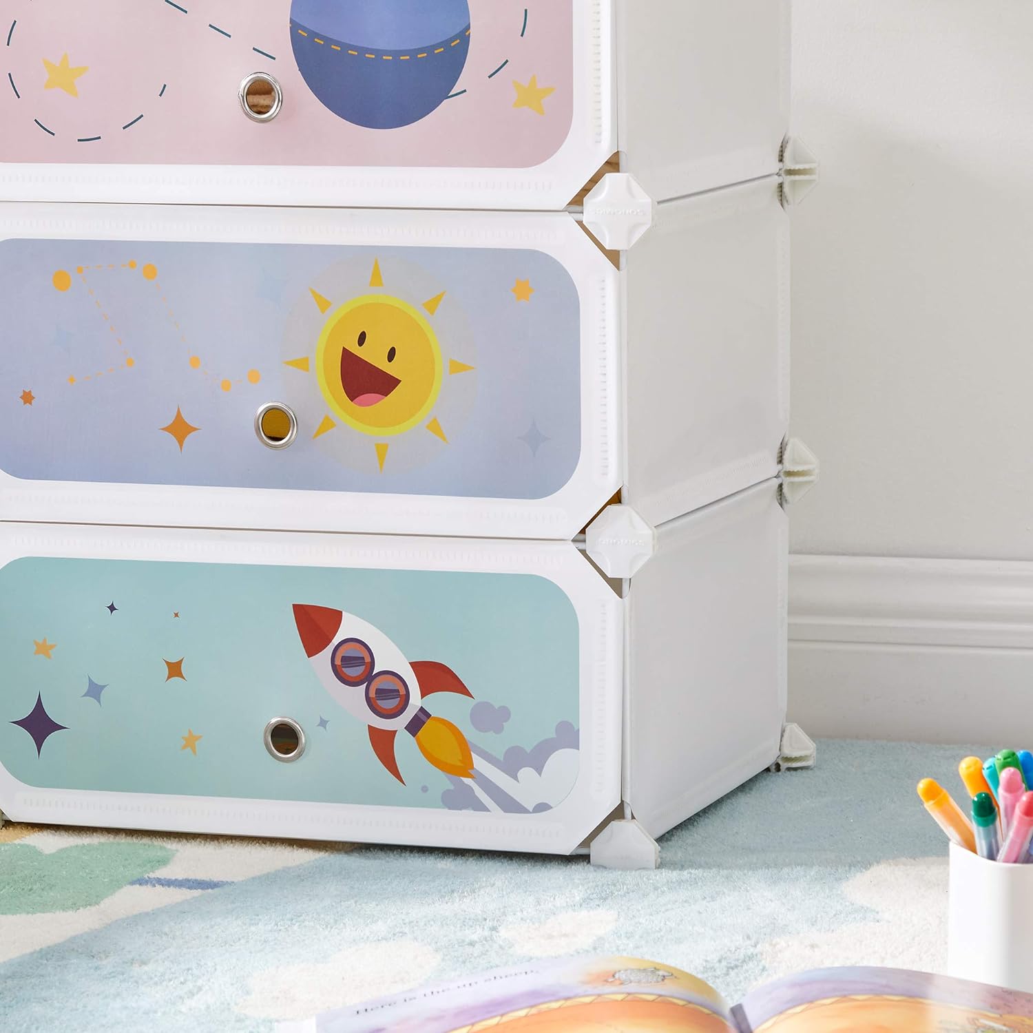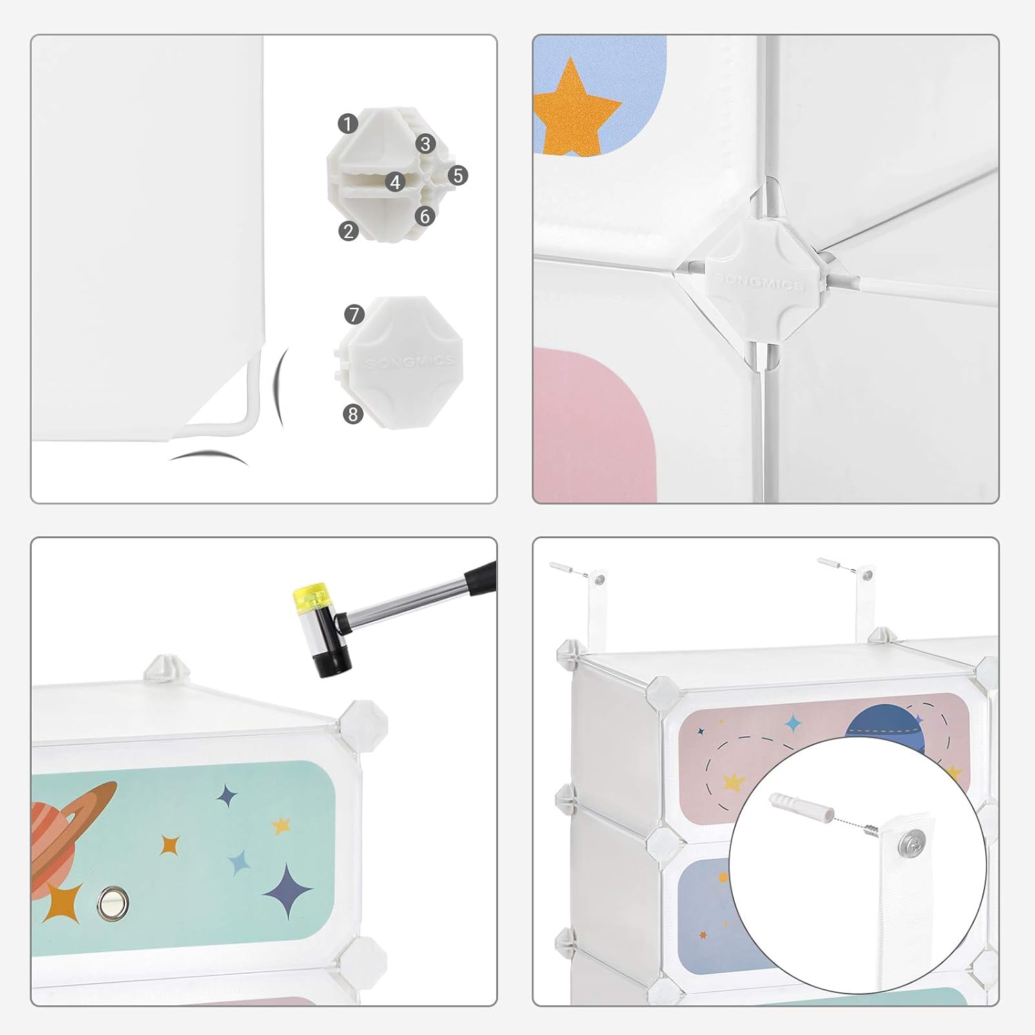 【ELEMENTOS PARA TU TRANQUILIDAD】Pon a tu pequeño primero, esta estantería modular tiene paneles de plástico PP unidos a conectores de ABS, estructura de metal para soportar hasta 10 kg por estante y viene con un dispositivo de fijación