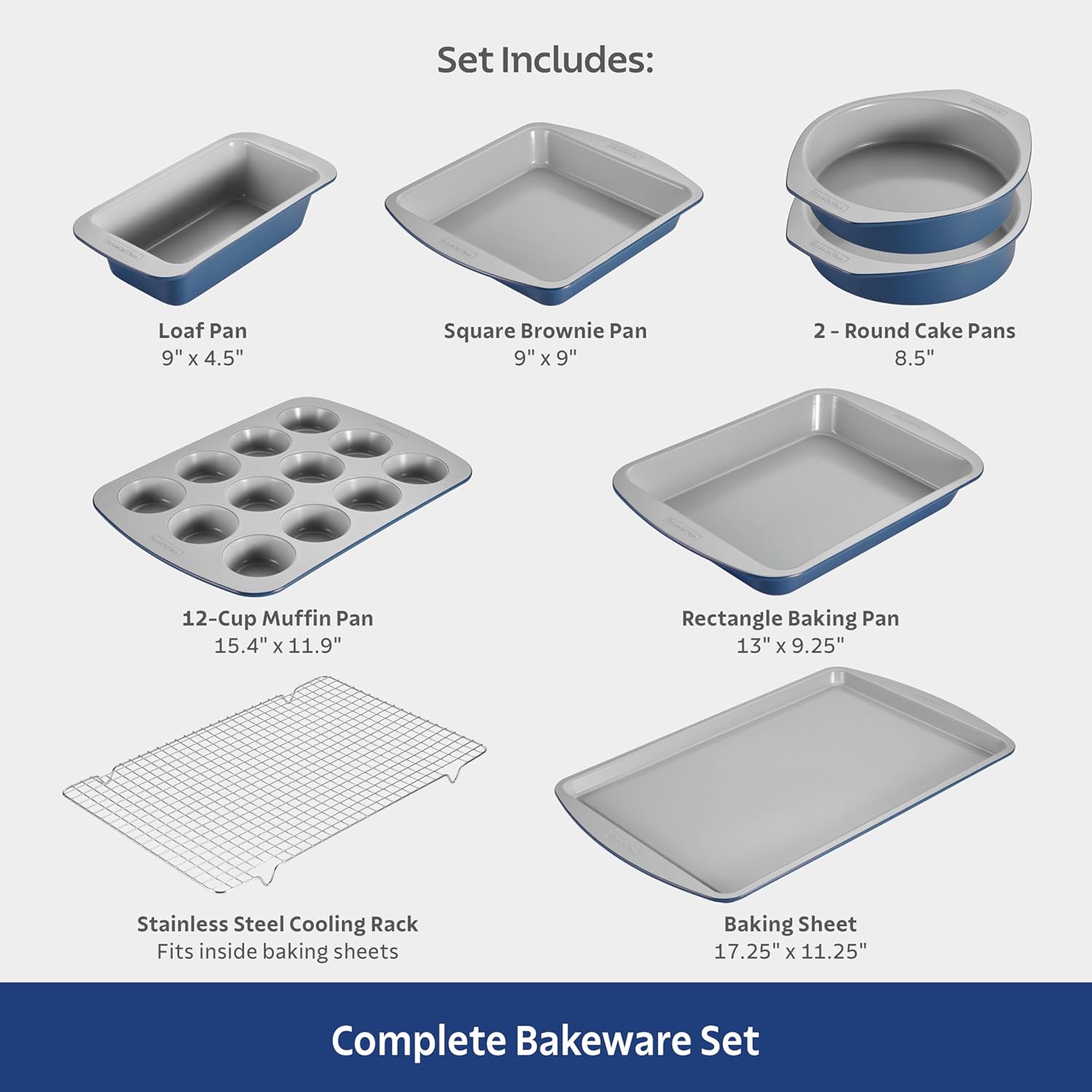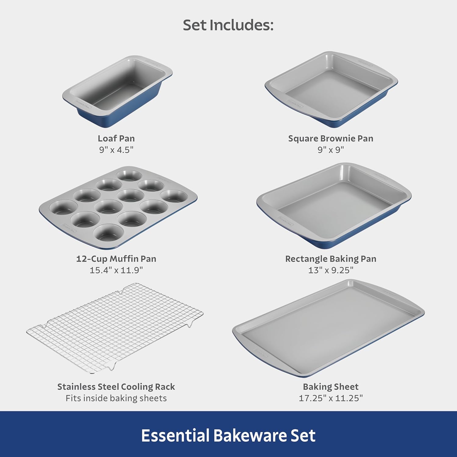 • Versátil juego de utensilios para hornear: este juego todo en uno incluye una hoja de galletas de 17.8 x 12.8 pulgadas, sartén de pan de 9 x 4.5 pulgadas, sartén de brownie de 9 x 9 pulgadas, sartén rectangular de 13 x 9.2 pulgadas, sartén para magdalenas de 15.4 x 11.8 pulgadas, y un acero inoxidable. rererererererere—Todo lo que necesitas para hornear deliciosas recetas en casa